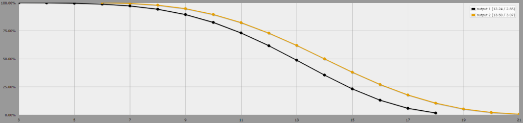 We can’t explode the d468 die, sadly. It has a very neat weighted danger curve. However, adding 3 to the result gives us this slightly more dangerous overall curve: