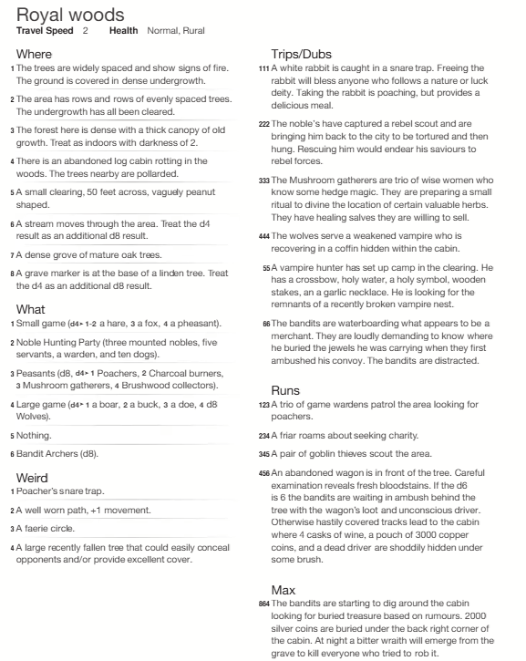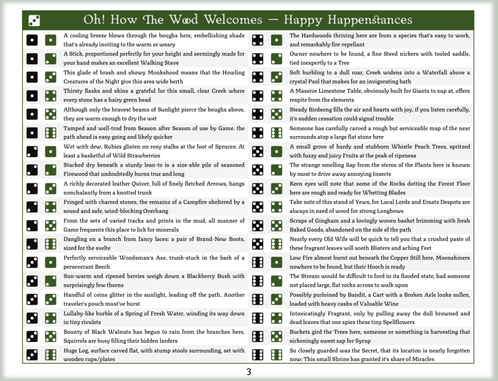 Ok, I don’t think I need to give an example of how to use a flat list, but just to clarify what the numbering would look like, for a d44 table for example, the leg hand column would be: 11, 12, 13, 14, 21, 22, 23, 24, 31, 32, 33, 34, 41, 42, 43, 44, for a total of 16 entries. Here’s an example of a d66 table from Forest Farragoes by kTrey of d4caltrops:
