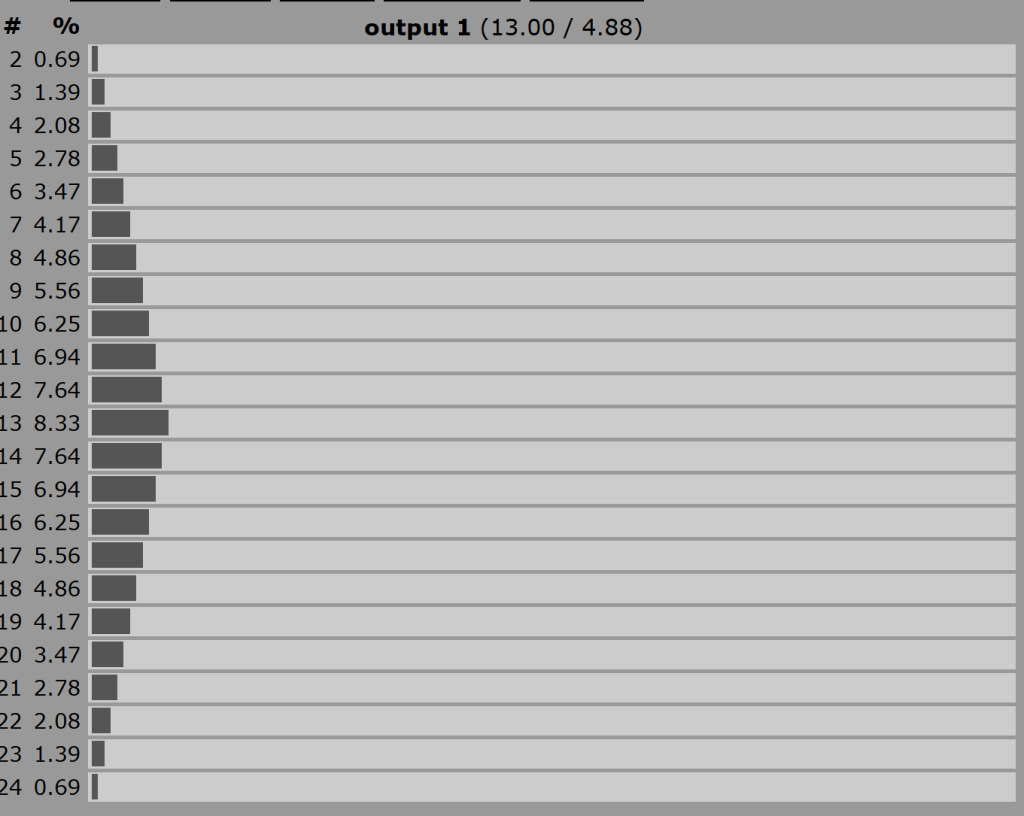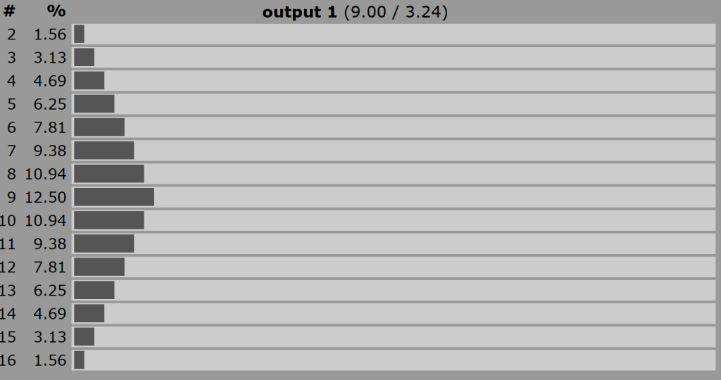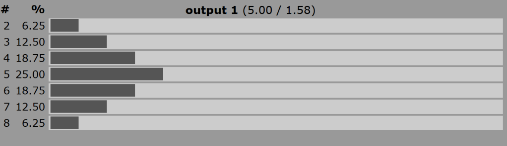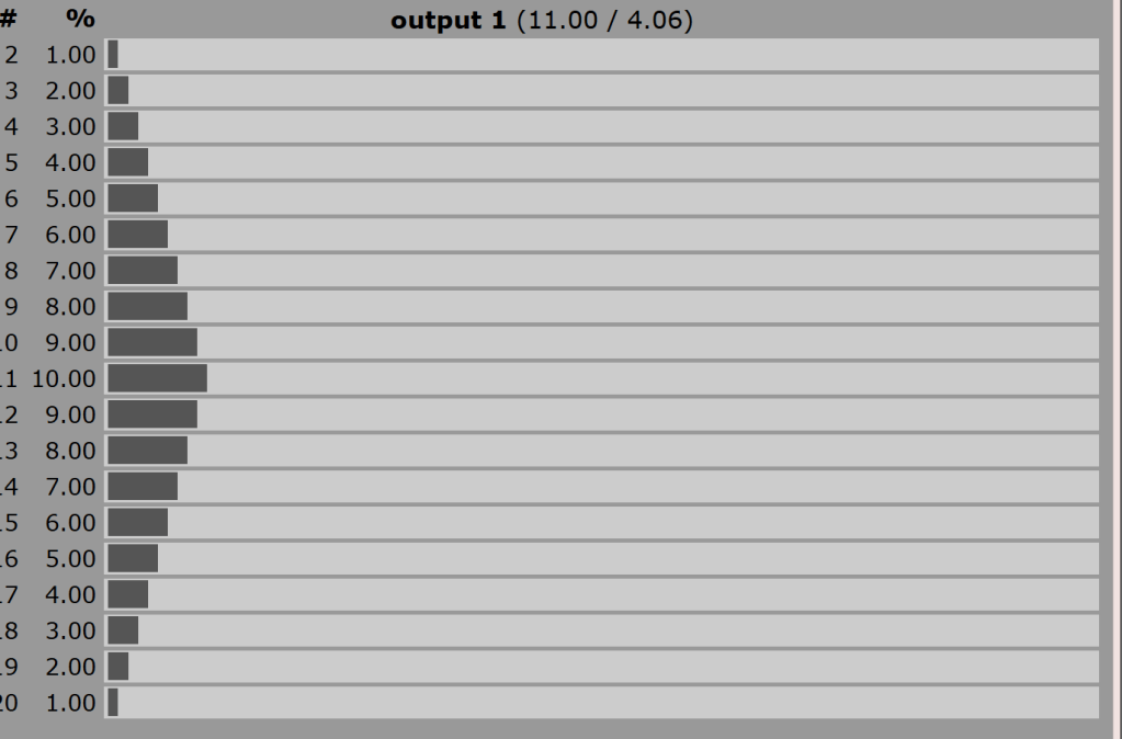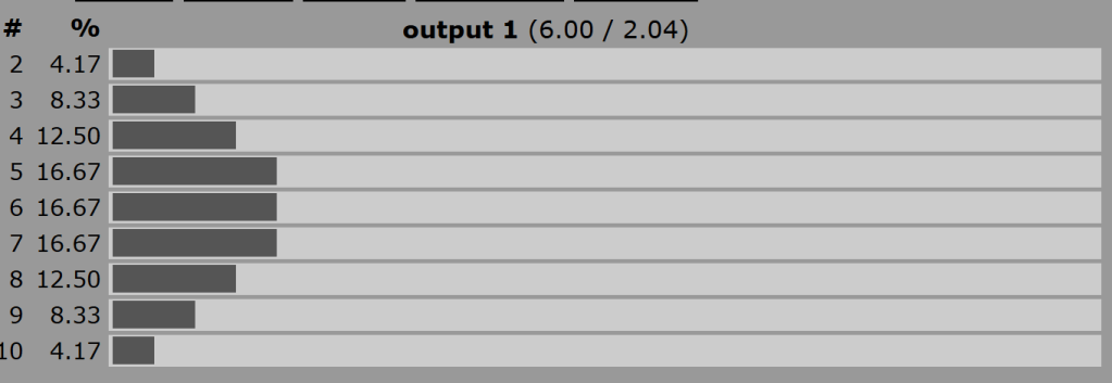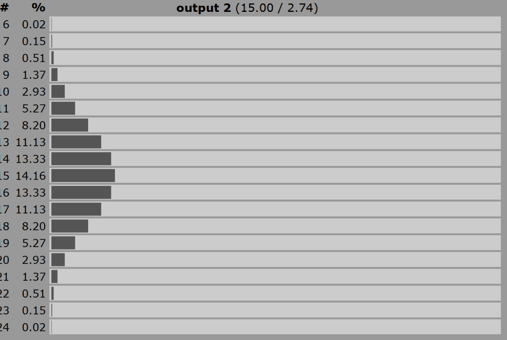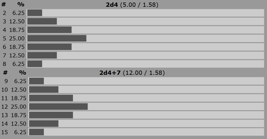 Whenever you roll 2 or more dice and then add the results, the likelihood of any given number in the available range is different. It follows a curve known as a bell curve. In this I’ll be using a bunch of anydice charts to help visualise things.