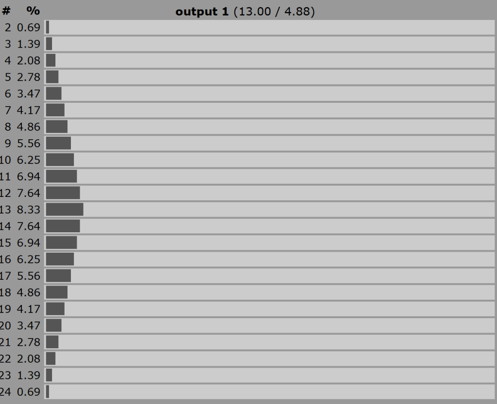 The key takeaway here: If you roll more than one dice together, you are changing the odds of your list appearing. Don’t just do it to get a range: “I want 18 results so I’ll just use 3d6” is wrong both because it only gets you 16 results, but also because you’ll rarely see a bunch of those results, and will commonly get a bunch of them. If you want to do that, look at Equal Opportunity Dice. By adding dice together, your values suddenly have meaning attached to them. You need to take advantage of that meaning, or it’ll change the way your table rolls.