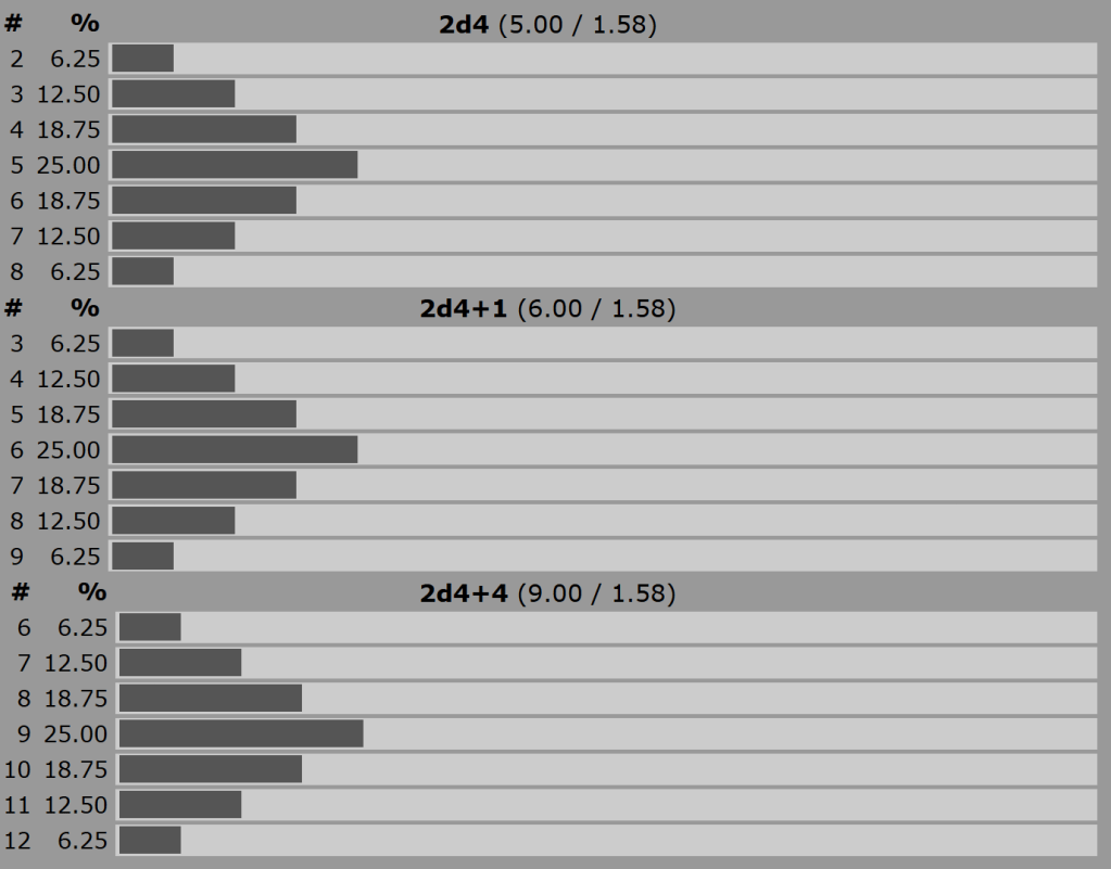 You can see here, that in the 2d4 curve, the likelihood of rolling a 6 is 18.75%, but when you add 4, it’s now 6.25%. Now, 18.75% of the time you’ll roll an 8 or a 10 instead. This is can be used in interesting ways: You could have a list of 13 items, and have a cumulative bonus applied to the roll as certain events develop, with the lower numbers on your list no longer occurring, the middle items changing likelihoods at first more so, and then less, and the higher numbers appearing. I could do this with an encounter table, for example, where the volcano slowly got closer to errupting over time, or a reaction table where you gained reputation over time. It might look like this: