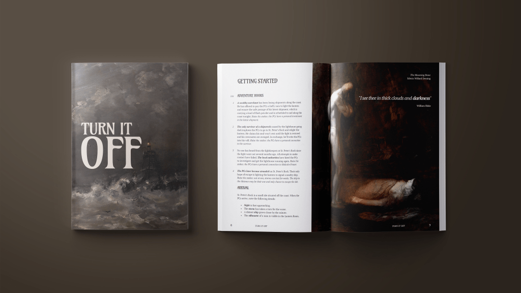Turn It Off uses the Explorer’s Template for it’s layout, but it does so with flare, breaking the grid, combining spreads for impact, and using horizontal splits. It’s really good. Art is in the public domain and is excellently curated, and all attributions are on the page. The large, gloomy choices of paintings are offset by poetry quotes, that add a lot to the aesthetic as well. All around smart choices, for a low-budget module.