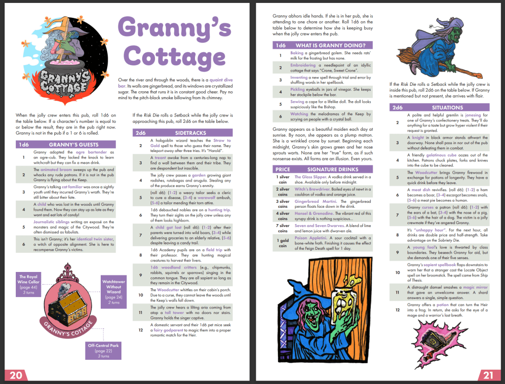 Writing more about Barkeep is challenging, because it’s a complex and intentionally varied experience, so I might pick out a few favourite moments of mine in it, by way of illustration. I love the way the politics are not subtle, but not communicated to the players through exposition: “Lizardfolk nuns hand out red pins. “Remember the Iron Fens Uprising. Mourn, yet organize!” Dwarf revelers try to get them arrested by Chaos paladins.” I enjoy how the signature drinks of each pub are simply excuses for the writers to be a little flashy and make puns: “Newest Corpse Revival. Won’t actually animate you with grotesque unlife but feels like it could. Gin, bits of orange.” I love how each situation (of which there are at least eleven for each pub) feels like a potential set up for an entire night of gamming: “A thrown spear narrowly misses the Barkeep. The bar is closed until somebody faces their wrath”, as do the sidetracks that are intended to be tangents: “A couple’s date is interrupted when one transforms into a wolf. Their date cries for help but won’t allow the wolf to be hurt.” Most of all I enjoy the subtlety of the connections: “The owner wanted to sell this rooftop karaoke bar and retire to a tropical island but discovered an endangered bird roosting in the rafters. Now any sale is prohibited by royal decree.” and then, in a table: “The phoenix in the rafters mistakes an ashtray for its murdered hatchling. The bartender commands everyone to sing a lullaby to soothe the phoenix’s fiery anger.” These are common, and excellent examples of how to world build without lore and endless exposition. To be clear about these examples, normally I take thorough notes as I read the module to find good exemplars of the writing. For Barkeep, I just flicked to a random page and had to choose from multiple excellent set ups on that page, all of which were worth quoting. This book is dense with gameable concepts and explosive situations in a setting that gives strong reasons for the Jolly Crew to participate in both debauchery and investigation, as well as strong reasons for the situations to be explosive.