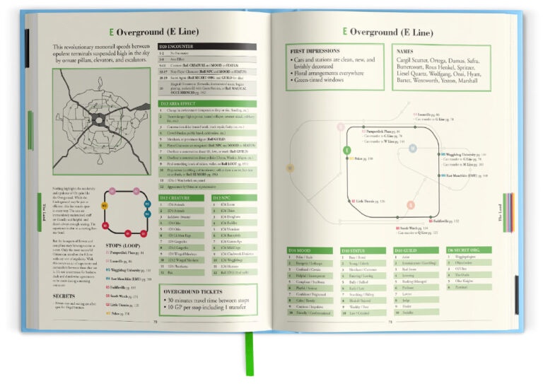 The layout is flashy and straightforward, with clear headings and use of colour for clear delineations. I wouldn’t recommend reading this on your phone, like I tried to do. It’s designed to thoroughly take advantage of the print format. Different pubs have unique colour signatures and title fonts, and fit to a spread. I’m usually an objector to having such highly variable headings, but they work here due to a very consistent format with exemplifying art, summarising paragraph and top left placement. Art is almost always palette-matched to the colour scheme of the associated pub, and uniformly matches the aesthetics of the piece. Every pub has its own stylised mini-map as well. I should probably back track a little and say that while the majority of the text is exceptionally laid out, the introductory sections don’t benefit from the consistency of the pub structure and are a little messier and more ad hoc.