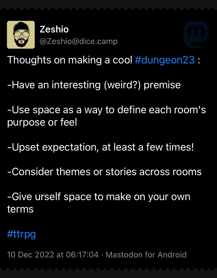 - Tuesday: Take the next layout from Marcia’s Bite-Sized Dungeons for this weeks’ sub-level. Generate a theme and faction for the sublevel using oracles. Detail the local faction and its punnet. Based on these, sketch the sub-level’s map.