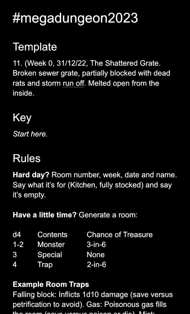 - Monday to Sunday: Draw and key a room. Detail any monsters, traps, treasure or NPCs in the room using oracles.