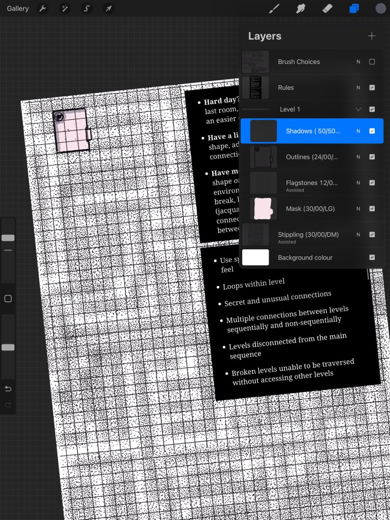 I’m going to start using a different weekly and monthly schedule, aiming to make a sub-level each week and then arrange them onto larger 24-28 room levels at the end of each month.